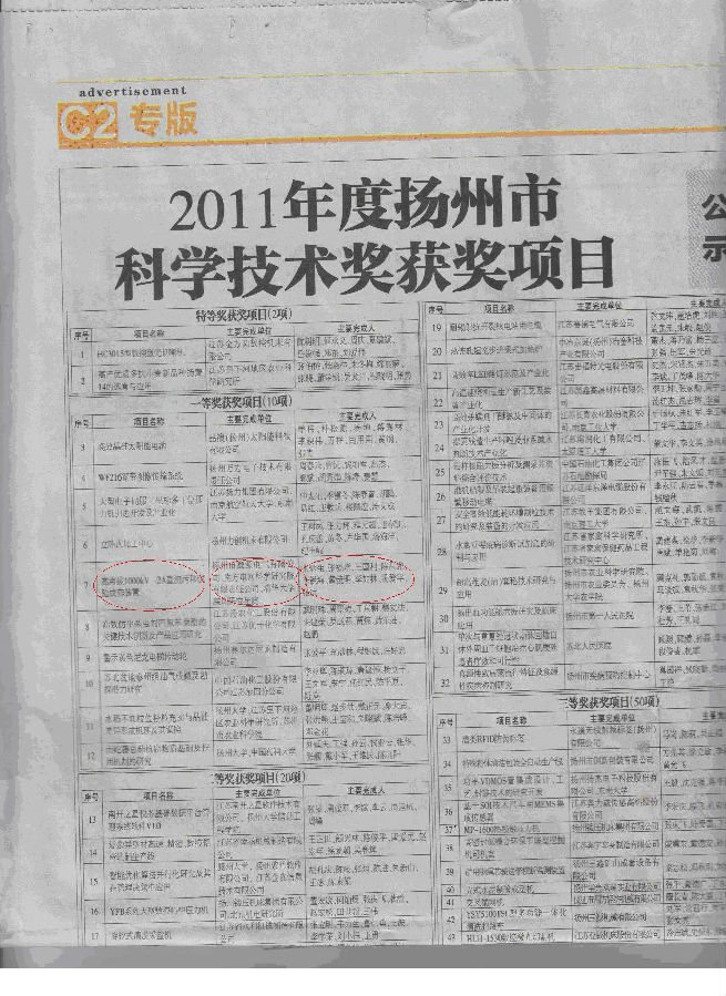 我公司高海拔1000kv/2A直流污秽试验装置非常荣幸获得2011年度扬州科学技术一等奖,我们感到由衷的兴奋和自豪,这是全体鑫源人的共同努力,共同奋斗的结果也是上级领导、社会各界以及我们鑫源电气的广大客户支持的结果。我厂将再接再厉,坚持“科技先行,以人为本”的发展观,争取在2012年获得更可喜的成绩!
