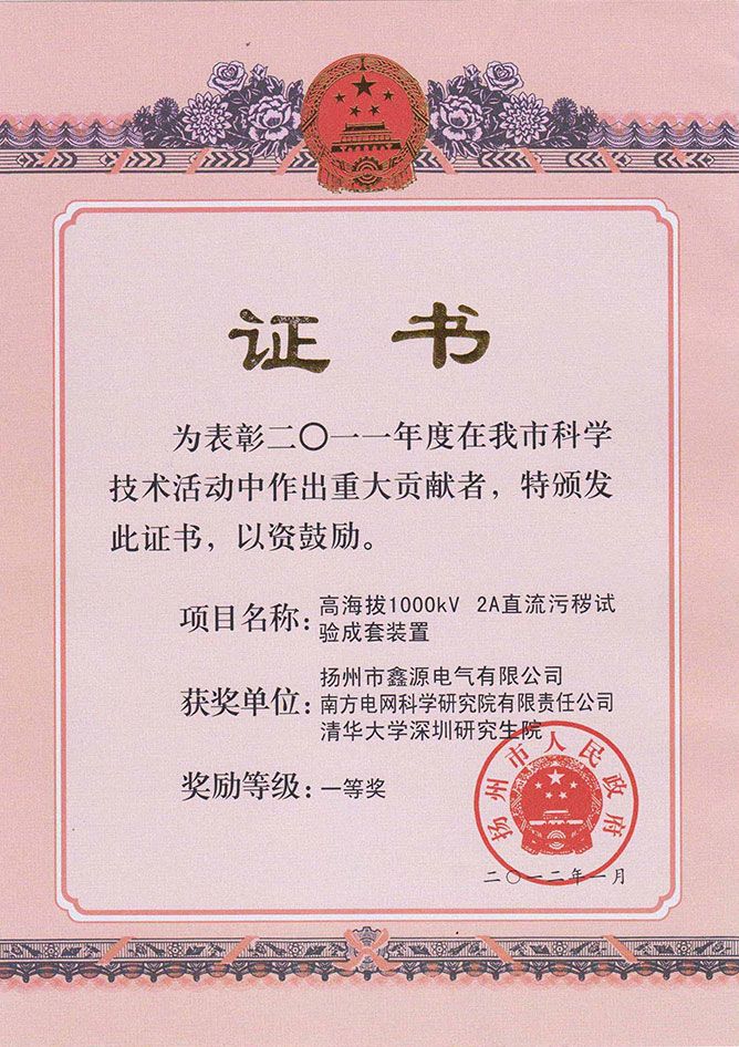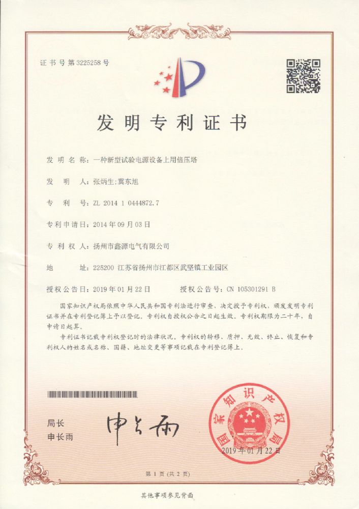 一种新型试验电源设备上用倍压塔-发明专利证书